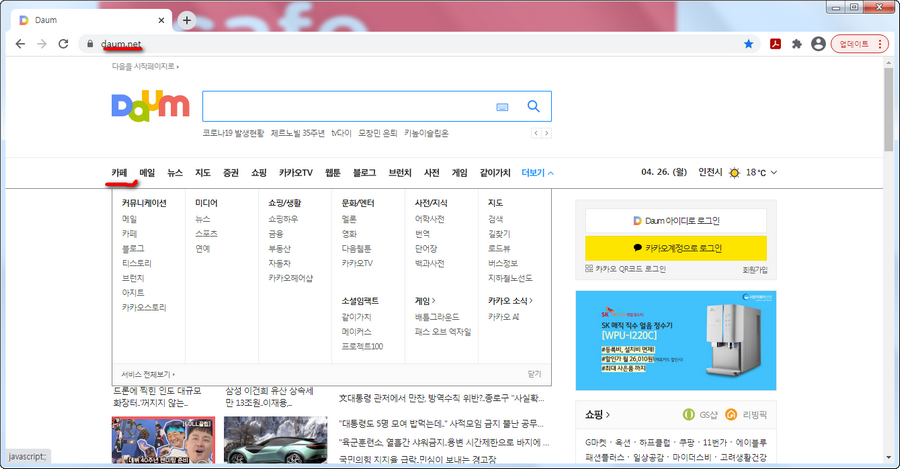그럼 어디에서 다음카페 바로가기를 찾을수 있을지 궁금해 하실것 같은데 다들 이미 쓰고 있는 다음 메인페이지를 살펴보시는 것이 가장 빠른 방법이랍니다. 거기에 살펴보시면 인기있는 메뉴들을 모와둔곳이 있는데 그곳에서 바로 찾을수 있을껍니다.