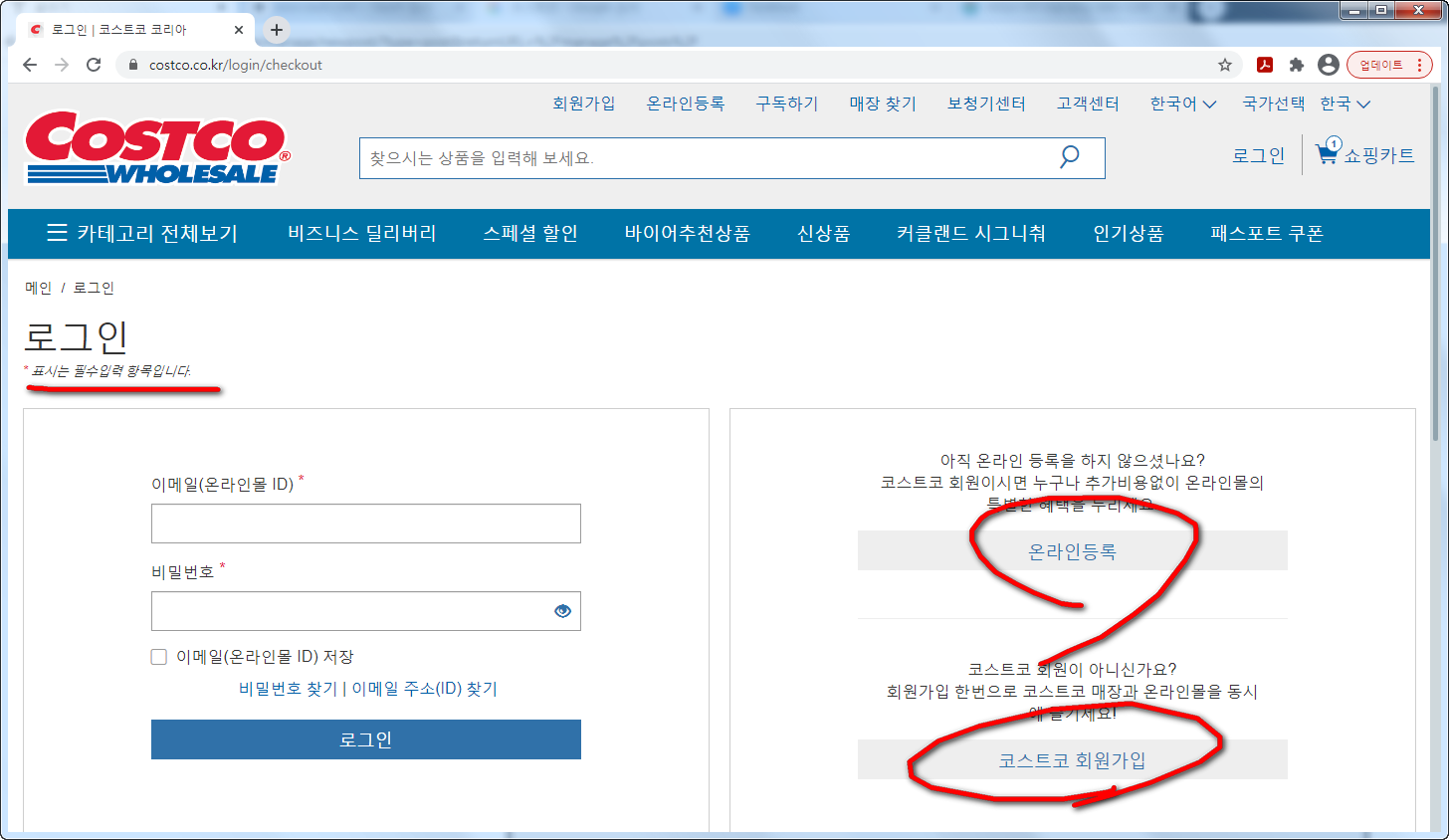 이미 오프라인 매장에서 코스트코 회원으로 가입을 하신분들이라면 굳이 새로 만들필요없이 온라인 등록이라는 매뉴를 사용하셔서 기존에 가입된 카드정보를 순차적으로 입력해서 가입을 진행하실수 있기때문에 어려움이 없을것 같은데요. 문제는 없는 분들입니다.