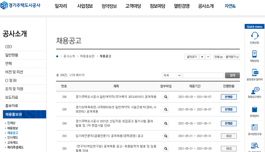 일자리 카테고리에서 채용공고를 확인해보시면 바로 현재 모집 중인 것에 대해서 안내를 받을수 있는데요. 주거복지 코디네이터 모집이나 일반계약직 시설근로자 공개채용이 2021년 6월 7일까지 진행된다고 써있죠. 공사 신입직원 필기 시험 결과 발표도 보입니다.