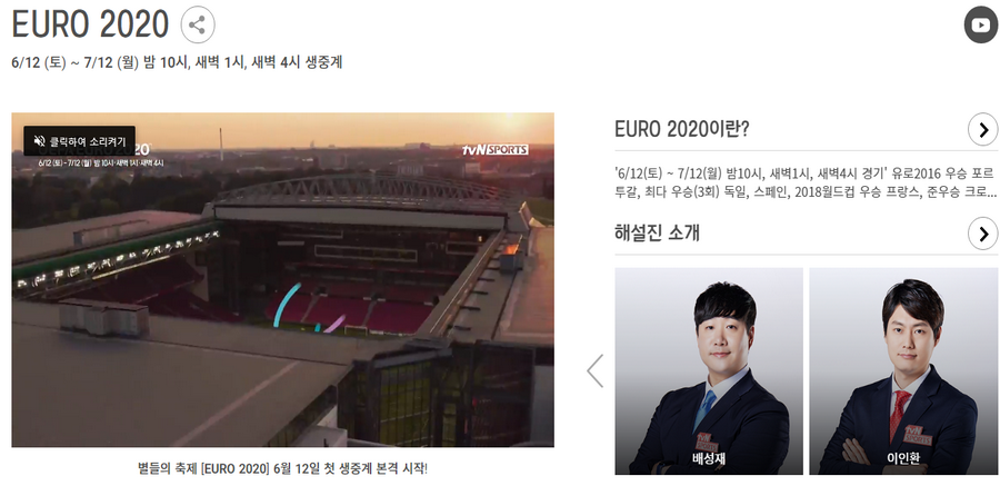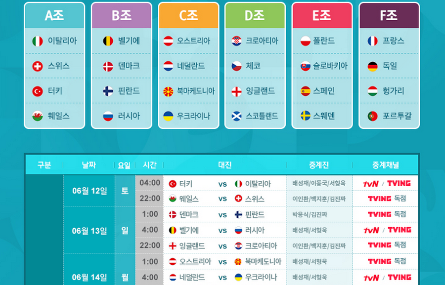 중계 일정 시간표 http://program.tving.com/tvn/uefaeuro2020/3/Contents/Html