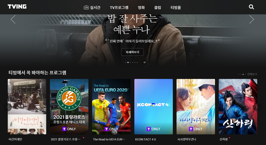 일단 확인해보니 아쉽지만 유로 2020의 경우에는 이곳에선 볼수 없습니다. 그럼 어디에서 중계를 시청할수 있을까요? 독점으로 이것을 방송할수 잇는곳이 하나 있었는데 바로 티빙이었습니다. 얼마전 프랑스오픈 테니스 대회를 단독으로 보여주었던 곳인데요.