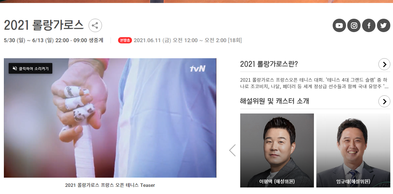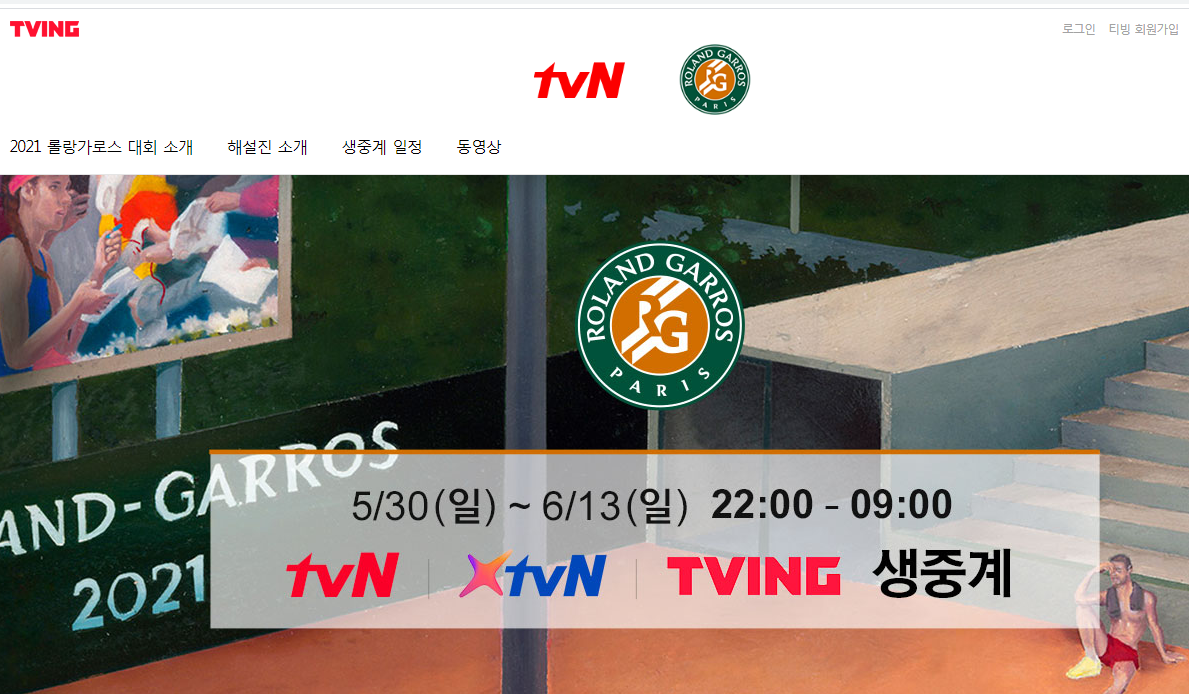 2021 롤랑가로스 프랑스오픈 테니스 대회. '테니스 4대 그랜드 슬램' 중 하나로 조코비치, 나달, 페더러 등 세계 정상급 선수들과 함께 국내 유망주 '권순우' 출전! 5/30(일) ~ 6/13(일) 22:00 ~ 09:00 tvN/Xtv