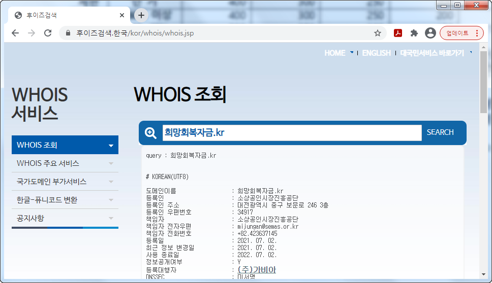혹시몰라서 희망회복자금.kr 주소를 확인해보았는데요. 아직 만들어지지는 않았지만 도메인 소유주는 이전과 마찬가지로 소상공인시장진흥공단에서 가지고 있더군요.