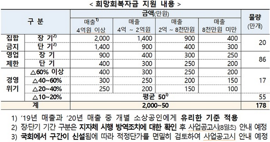 출처 : 정책브리핑 대략적으로 지원 받을수 있는 부분에 대해서 확인해보면 매출에 따라서 받을수 있는 금액이 차이가 있습니다. 이전과 마찬가지로 집합금지업종과 영업제한업종에서는 분명하게 차이가 있으니 본인이 속한 구간을 보시면 되겠습니다.
