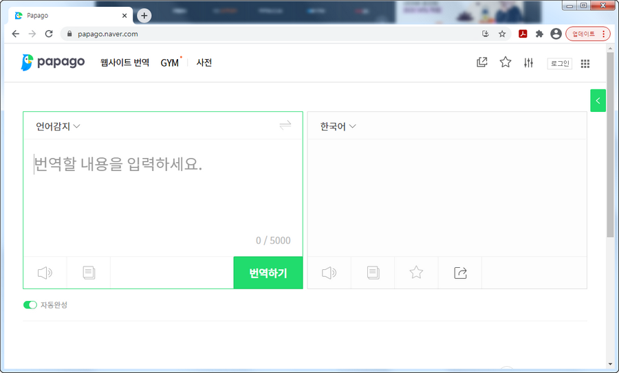사실 파파고는 별도의 사이트를 가지고 있습니다. 거기에서 내용을 넣어서 원하는 말로 바꾸어 볼수 있습니다. 왼쪽 부분이 궁금한 것을 넣어주는 겁니다.