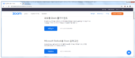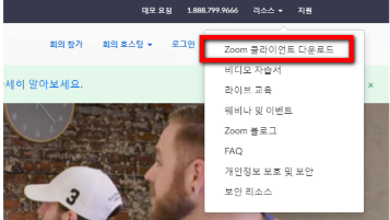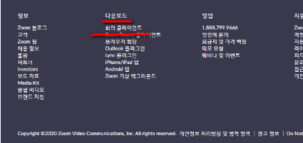 보통 홈페이지 가장 아랫쪽이나 가장 위에서 오른쪽을 보시면 해당 메뉴를 찾을수 있는데요. 회의용 클라이언트나 zoom 클라이언트 다운로드를 이용하시면 여러가지 기기에서 쓸수 있는 설치파일을 받을 수 있습니다.