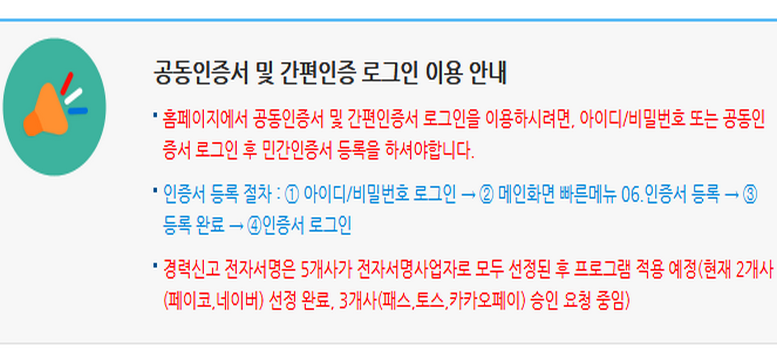 이후에 본인이 가진 공동인증서나 간편인증등을 사용해서 로그인을 하시면 되는데요. 인증서 등록 같은 경우에는 아이디와 비번으로 로그인을 먼저 진행하시고 인증서등록 항목에 가셔서 등롭부터해야합니다.