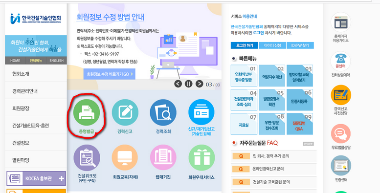 처음에 협회 홈페이지에 들어가시면 메인 화면에 아이콘으로 증명발급이라는 것이 보이실꺼에요. 그것을 이용하시면 되는데요. 당연히 먼저해야하는 것이 로그인이랍니다.