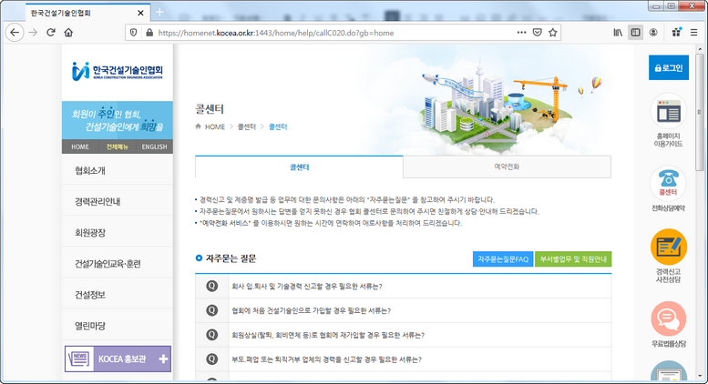 건설기술인협회에 문의사항이 있으신 분들은 먼저 콜센터 페이지에서 자주묻는 질문을 보시기 바랍니다. 이를 확인하시고 해결이 안되는 경우에는 예약전화를 이용하시면 되는데요. 단 해당 메뉴는 로그인한 분들이 쓸수 있습니다.