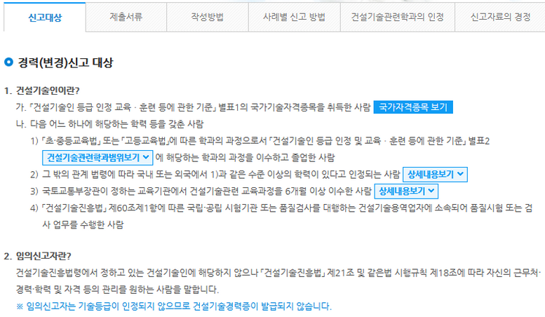 여기서 제일 중요한것이 건설기술인 등급 인정 교육이나 훈련에 의해서 국가기술자격종목을 딴분들을 말한다고 하는데요. 몇가지 항목이 있으니 이부분에 해당이 되는지를 먼저 점검합니다. 문제는 이러한 자격종목이 없는 분들은 임의신고자로 등록해야하는 것인데 기술등급이 인정되지 않는다고 합니다.