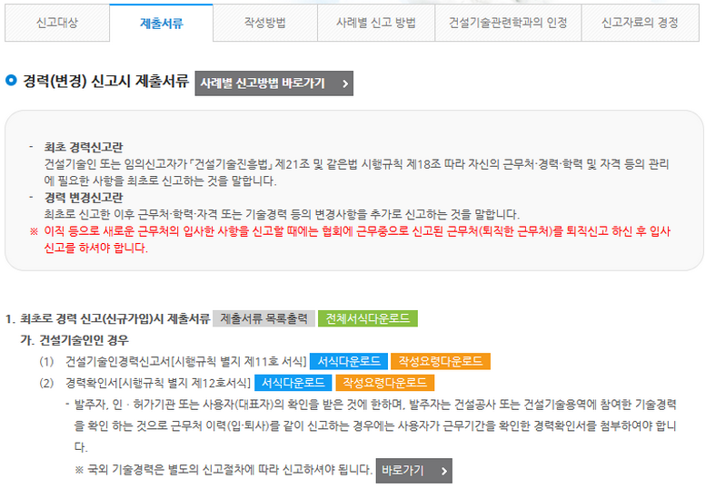 기본적인 경력 신고절차를 진행하셔야 하는데요. 서식을 다운로드 받으시고 이를 작성하셔야 합니다. 경력확인서 같은 경우에는 발주자, 인허가기관, 사용자의 확인이 필요하다고 합니다. 이게 항목마다 차이가 있습니다. 자 이런것이 완료되신 분들을 기준으로 신청은 다시 메인페이지를 보셔야 합니다.