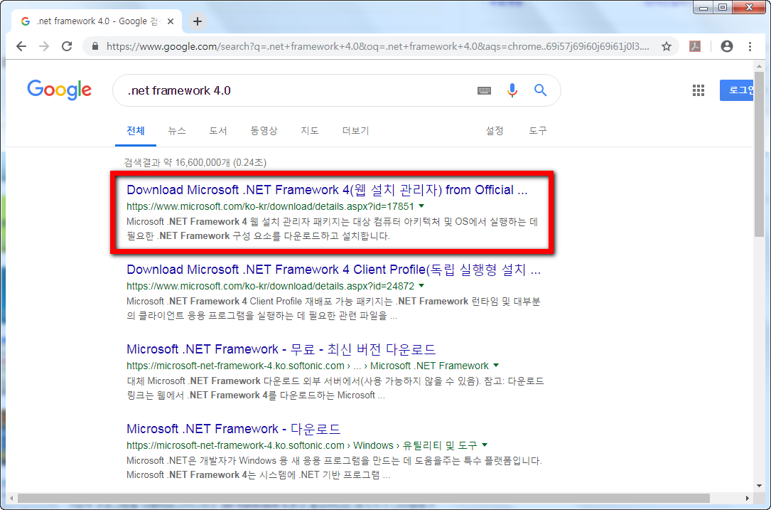 가장 쉬운방법은 만인의 검색 포털 구글을 이용하는 방법입니다. 우선 www.google.com에 들어가셔서 검색어 입력창에서 .net framework 4.0을 넣어주시고 돋보기를 선택하시면 첫번째 결과에 우리가 원하는 항목을 바로 확인할 수 있습니다. 검색순위가 변경될수 있으니 꼭 웹 설치 관리자라고 쓰여있는지 확인해보세요.